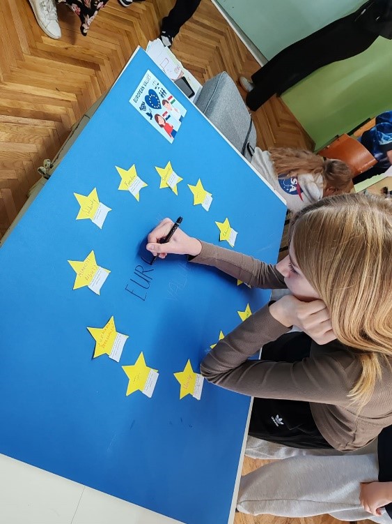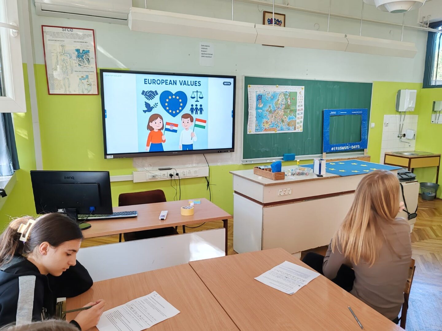Zajedničkim smo snagama učili, istraživali i predstavljali najvažnije europske vrijednosti ostalim učenicima i posjetiteljima škole. Sve države članice EU-a dijele određene temeljne vrijednosti koje čine osnovu slobodnog i demokratskog društva, a Europska unija ih štiti poticanjem uključivosti, tolerancije, pravde i solidarnosti.