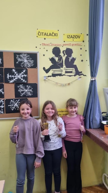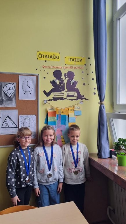 Završili smo i s projektom Čitalački izazov. Učenici su od mjeseca listopada čitali priče te pisali za njih preporuke svojim prijateljima. 1. krug izazova bio je kroz Mjesec hrvatske knjige, a 2.krug do Svjetskog čitanja naglas. Obogatili smo rječnik i poboljšali tehniku čitanja. Učenici koji su pročitali najviše priča dobili su medalje i prigodne poklone.